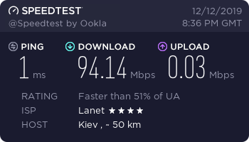 Сегодня потребовалось перекинуть файл на 7Мб и не получилось загрузить его на файлообменник. SpeedTest показал практически отсутствие аплоада: https://www.speedtest.net/result/8848487485